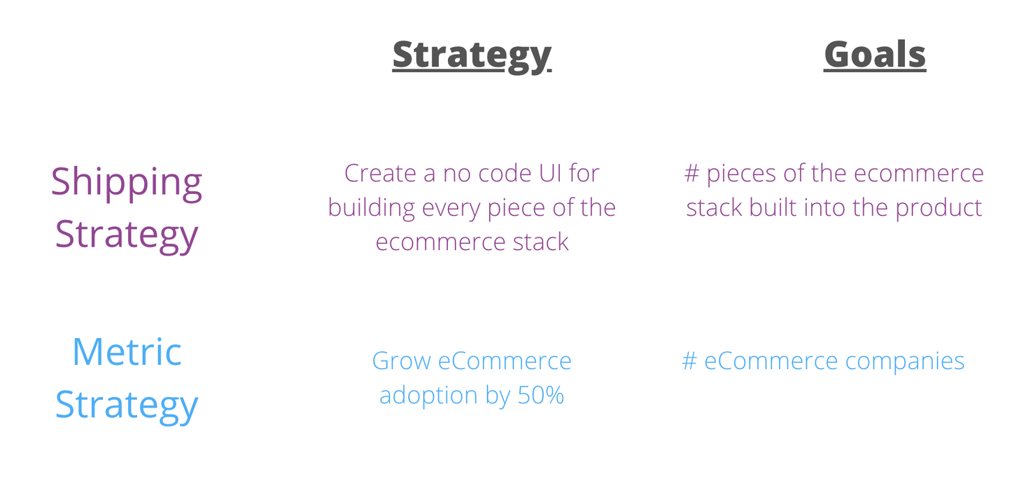 The problem is that for most companies, metrics might not come into play at any stage of this hierarchy. Suppose you have a company with a mission of "Enable everyone to have their own business" and a vision of "Create a platform that anyone can build anything on". Here are two examples of strategy and goals, one which is a product shipping strategy, and one that is a metric strategy